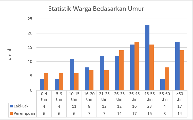 Statistik berdasarkan umur adalah kumpulan data yang menggambarkan distribusi usia dalam suatu populasi atau kelompok tertentu. Berikut ini merupakan sebuah statistik berdasarkan umur dari warga Padukuhan V panjatan, statistik berikut diperoleh dari dari sensus kependudukan pada tahun 2019.